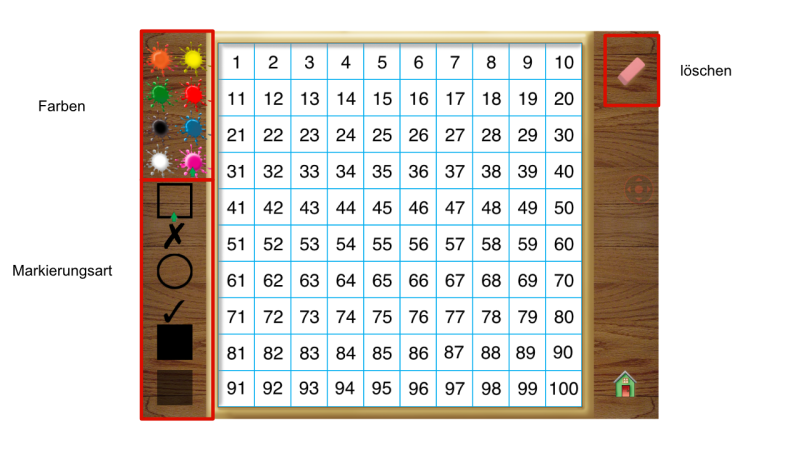 Eine Hundertertafel zum Zählen und Markieren. Genaue Anwendungsmöglichkeiten sind in der Dokumentation beschrieben.
