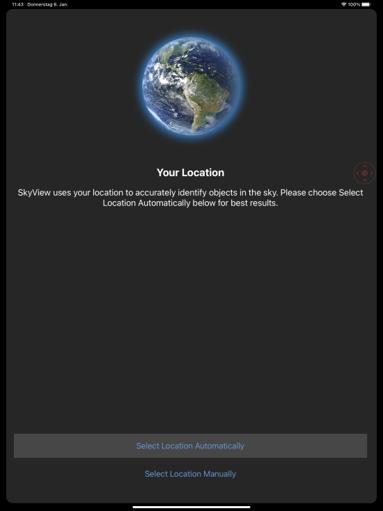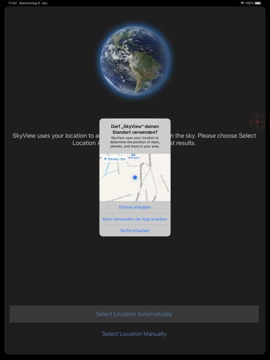 Erlaubnis geben, dass das App dich orten kann. „Select Location Automatically“ tippen.