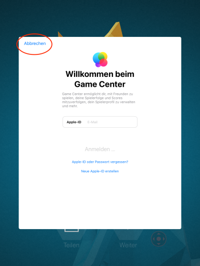Das Gamecenter brauchst du nicht, tippe Abbrechen.