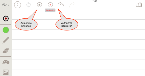Leider hast du keine Möglichkeit, in mehreren Schritten die Aufnahme zumachen oder die Aufnahme zu bearbeiten. Wenn etwas schief lief, musst du mit der Aufnahme nochmals beginnen.