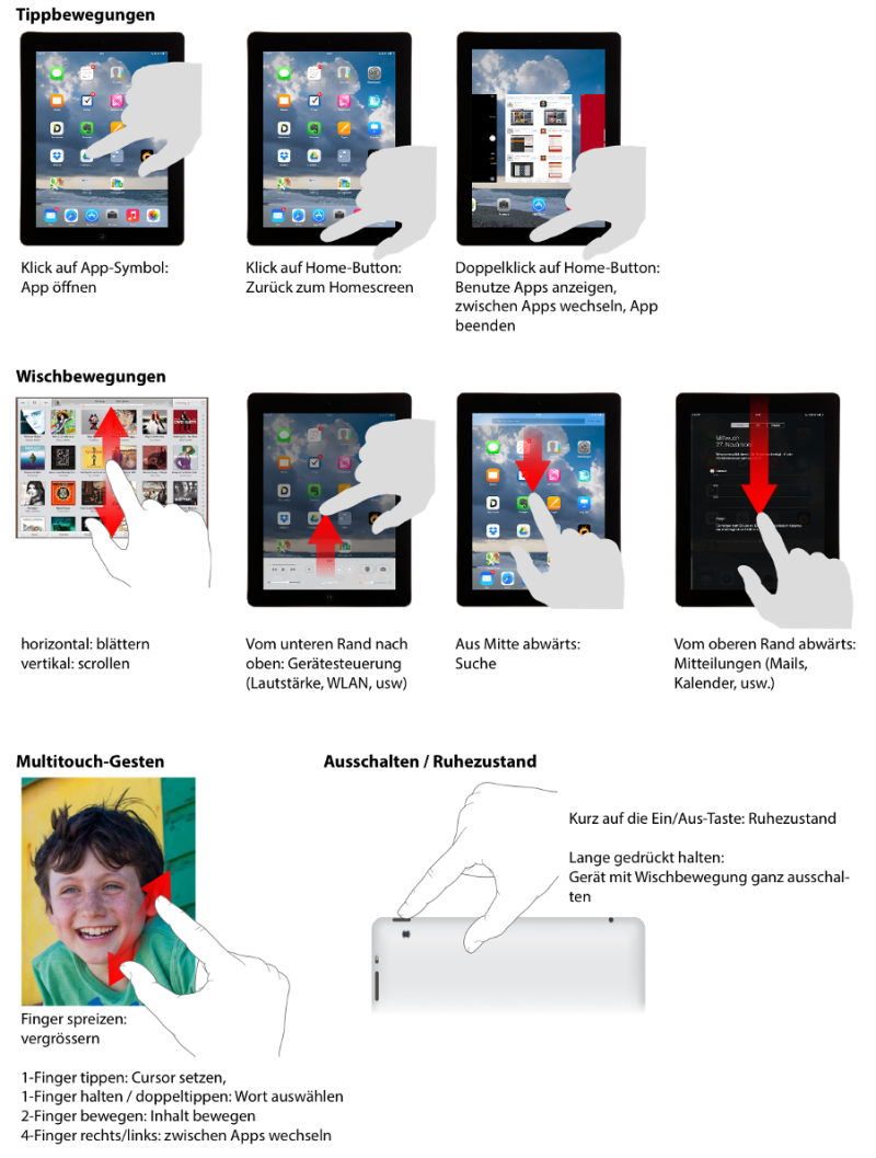 Die grundlegenden Gesten werden nochmals im Benutzerhandbuch iPad erklärt.