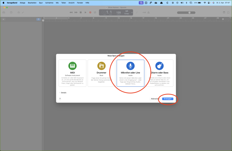 Für eine Tonaufnahme, muss zuerst das Garageband vorbereitet werden und entschlakt werden. Diese Schritte erklären wir hier.