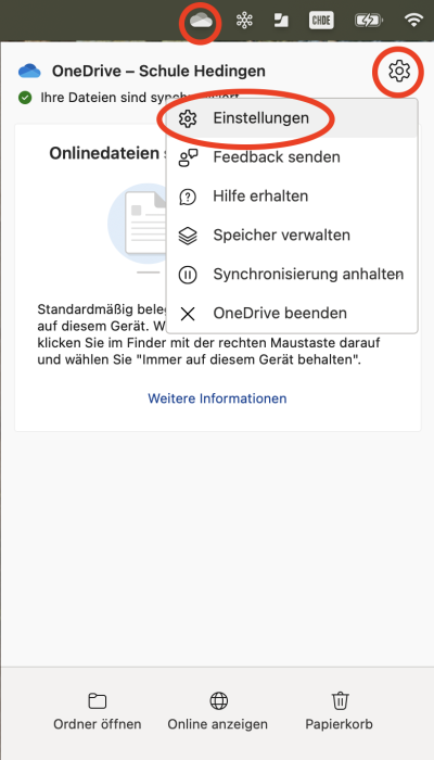 1:) Öffne Onedrive oben in der Menu-Leiste und gehe zu den Einstellungen.