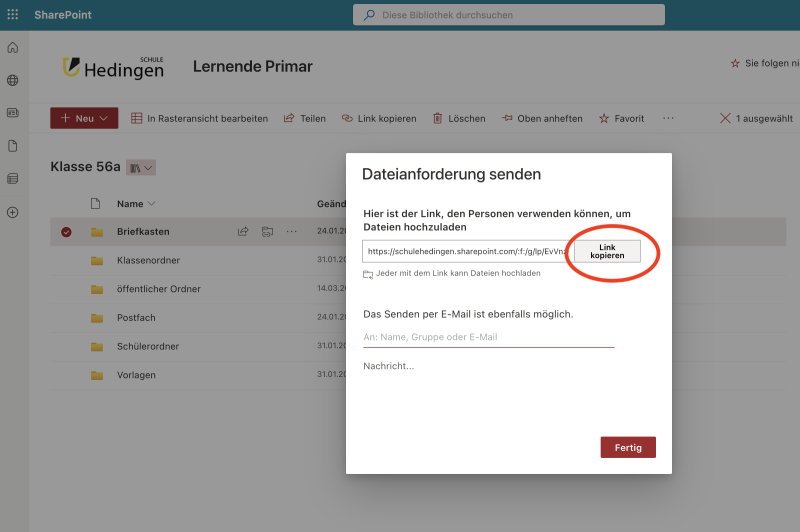 Damit die Schülerinnen und Schüler Dateien hochladen können, brauchen sie einen Link. Diesen Link kannst du auf Sharepoint anfordern.