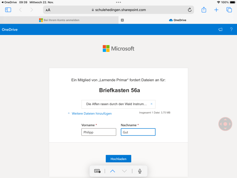 Nun kannst du den Schülerinnen und Schüler den Link zur Verfügung stellen. Dabei kommen die Schülerinnen und Schüler auf eine separate Seite, wo sie die Datei hochladen können.