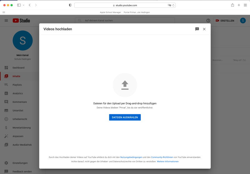 Um auf Youtube ein Video hochzuladen, kannst du dich mit unserem Schul-Account anmelden. Die Daten dafür findest du auf Sharepoint unter Informatik > Acclunts > Stufenaccounts.