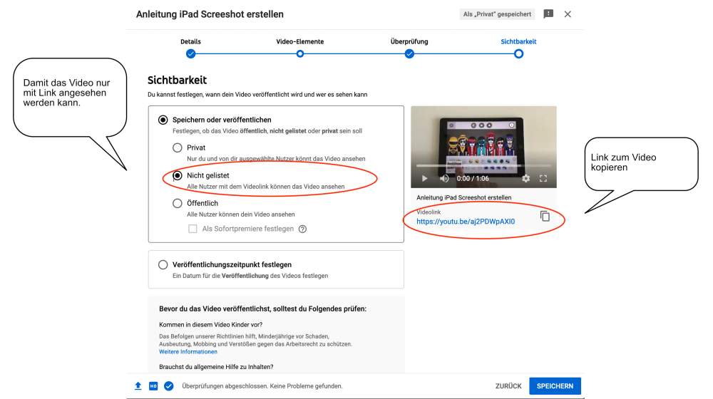 Hier wird eingestellt, wie das Video im Internet erscheint. Bis jetzt haben ich „nicht gelistet gewählt. Somit ist das Video nur auffindbar, wenn man den Link dazu hat.